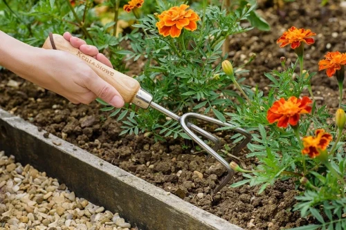 Този удобен инструмент има 3 зъбци, с които култивира и разрохква почвата преди засаждане.