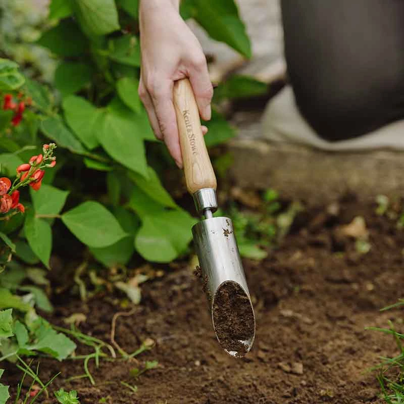 Ръчен инструмент за засаждане на луковици с ъглова глава със заострен ръб за лесно навлизане в почвата, той премахва сърцевина с диаметър 4 см от земята, идеален за малки луковици и растения.