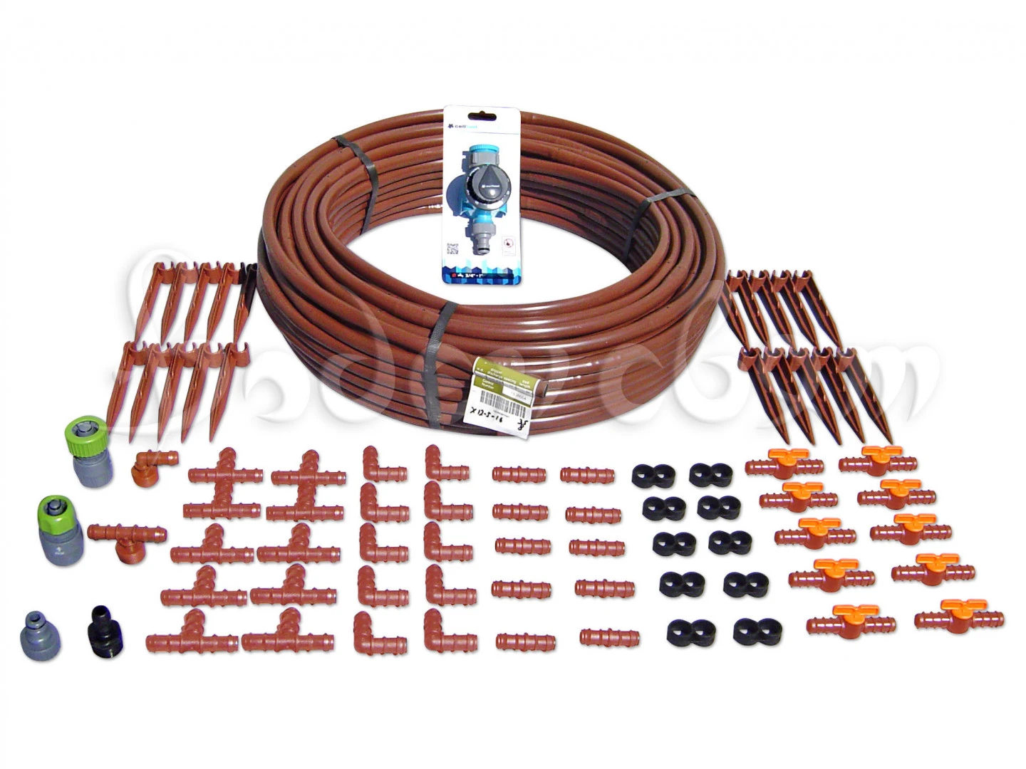 Комплект за капково напояване със захранване от градински маркуч и управление с механичен таймер е удобен за всякакъв вид градини и култури. Готов за инсталиране и директен монтаж. Съдържа всичко, от което имате нужда, комплектът е предвиден да се захранва с чиста (чешмяна) вода - няма нужда от филтър. Комплектът е с капков кафяв маркуч!