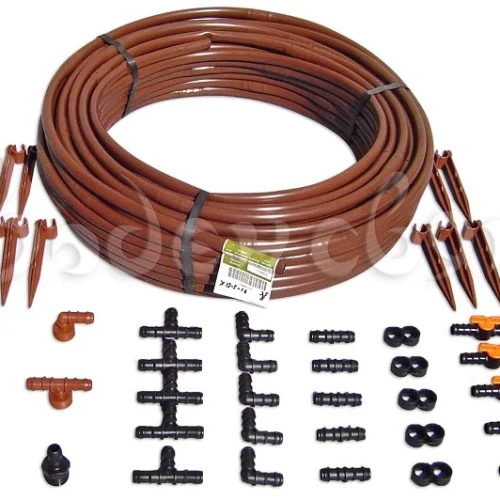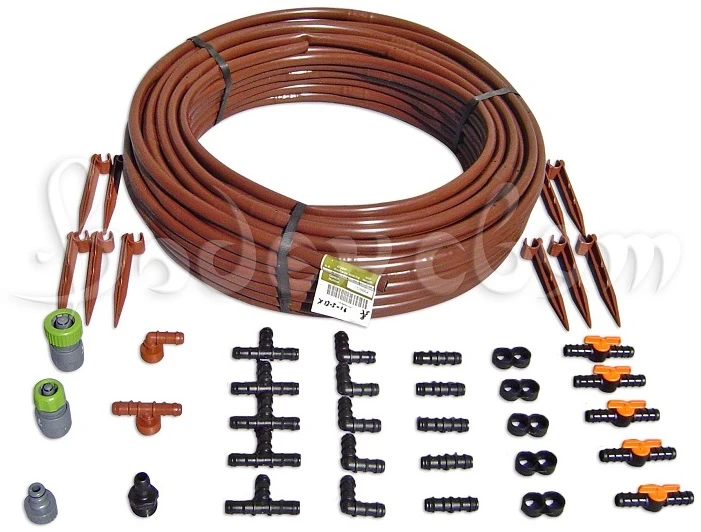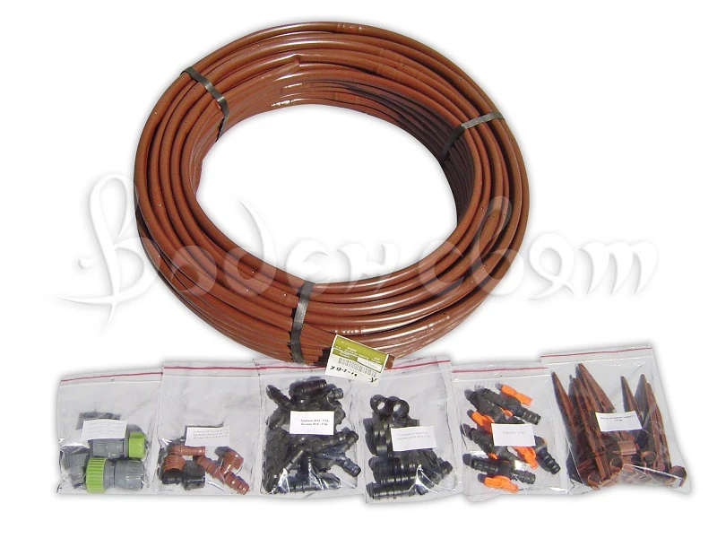Комплект за капково напояване със захранване от градински маркуч е удобен за всякакъв вид градини и култури. Готов за инсталиране и директен монтаж. Съдържа всичко, от което имате нужда, комплектът е предвиден да се захранва с чиста (чешмяна) вода - няма нужда от филтър. Комплектът е с капков кафяв маркуч!