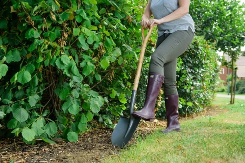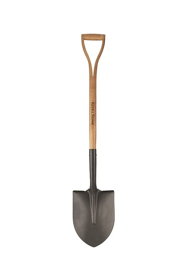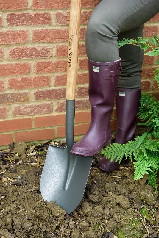 Традиционна, ръчно изработена лопата от въглеродна стомана, подходяща за трудни за работа почви.