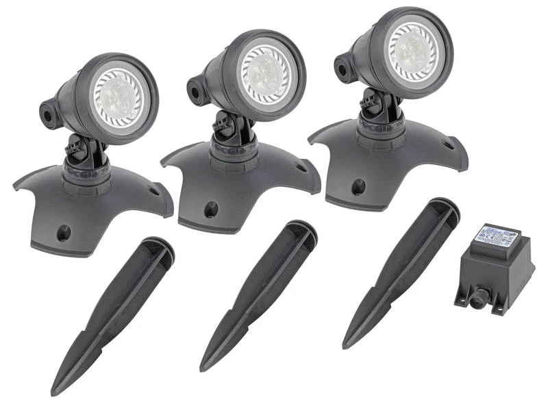 Съдържание - 3 прожектора, 12 V трансформатор, колчета за наземно фиксиран