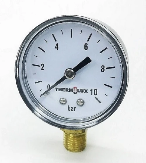 Манометър за битови и индустриални приложения, отоплителни, парни, соларни и др. инсталации, и уреди които работят с вода. Тип на монтажа: вертикален (радиален - долно присъединяване). До 10 bar!
