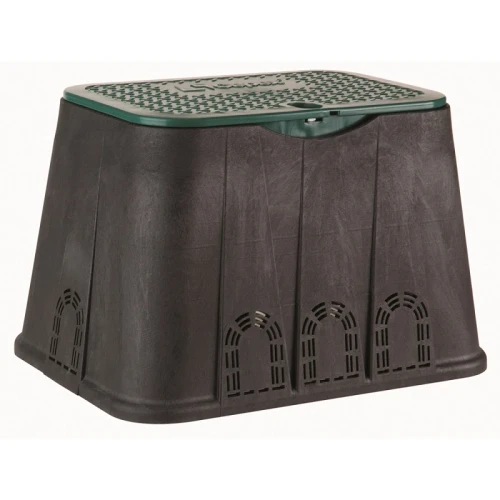 Правоъгълна шахта за клапани 12 inch. Шахтата се вкопава в земята и побира до 3 клапана или 3 крана. Декоративен зелен капак със заключващ болт.