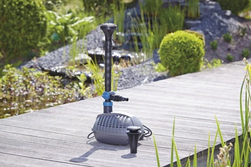 Сет готов за работа - помпа с 2 броя дюзи. Лесна за инсталиране помпа, с възможност за нагласяне на височината. Допълнителен изход за малки по площ водоеми.